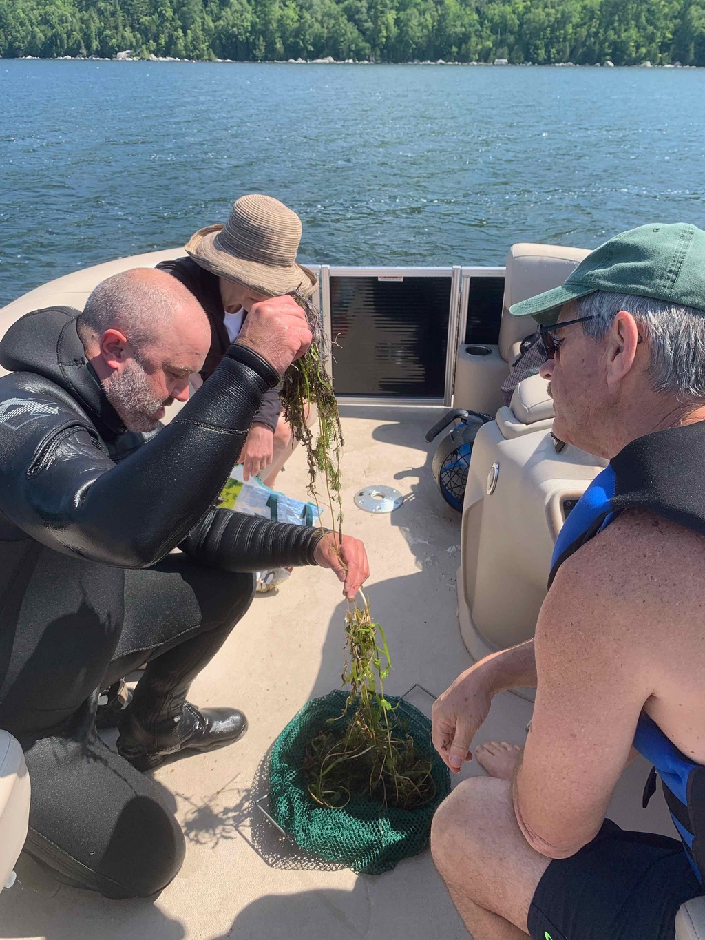 CLPA volunteers identify and monitor new and spreading Eurasion watermilfoil. Once identified, the CLPA hires a specially-trained diver to remove the milfoil using various techniques, including diver-assisted suction harvesting (DASH). DASH is a chemical-free method for removing invasive aquatic plants using divers with specialized equipment to uproot target plants and feed them into a suction hose for collection and disposal, effectively removing the entire plant, roots and all, to prevent regrowth. This technique protects native plants while controlling invasive species like Eurasian Watermilfoil, making it an effective and eco-friendly alternative to herbicides.